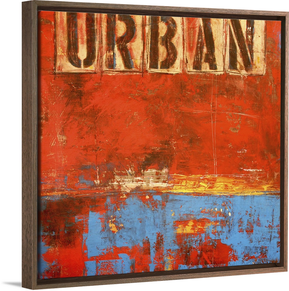 <p>Contemporary abstract painting of a weathered grungy dark orange and blue tones with the word "Urban" stenciled at the top.</p>