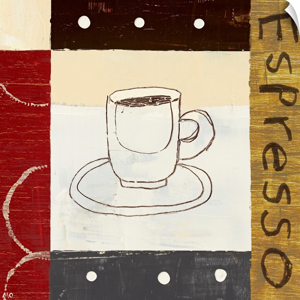 <p>Square decorative wall art of a drawing of a cup of espresso surrounded by blocks of color and texture.</p>