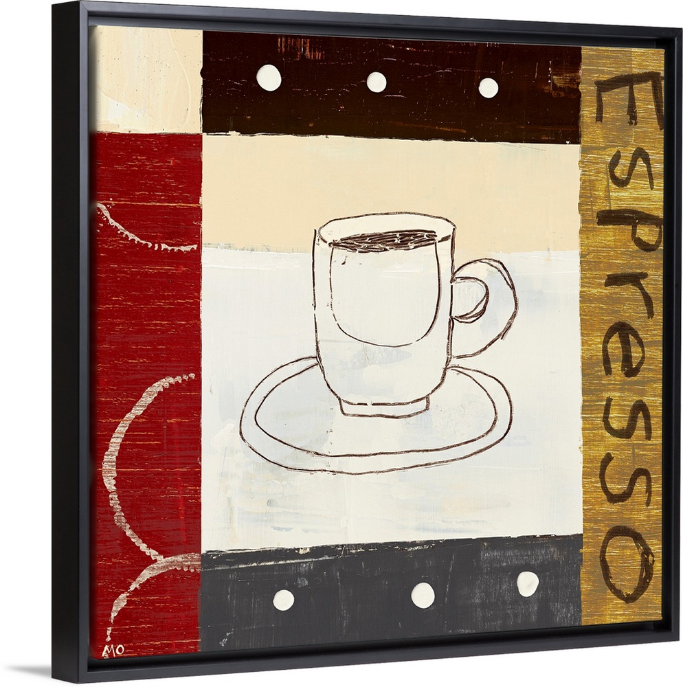 <p>Square decorative wall art of a drawing of a cup of espresso surrounded by blocks of color and texture.</p>