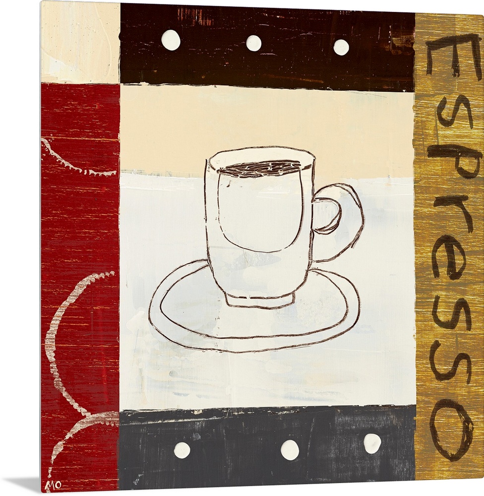 <p>Square decorative wall art of a drawing of a cup of espresso surrounded by blocks of color and texture.</p>