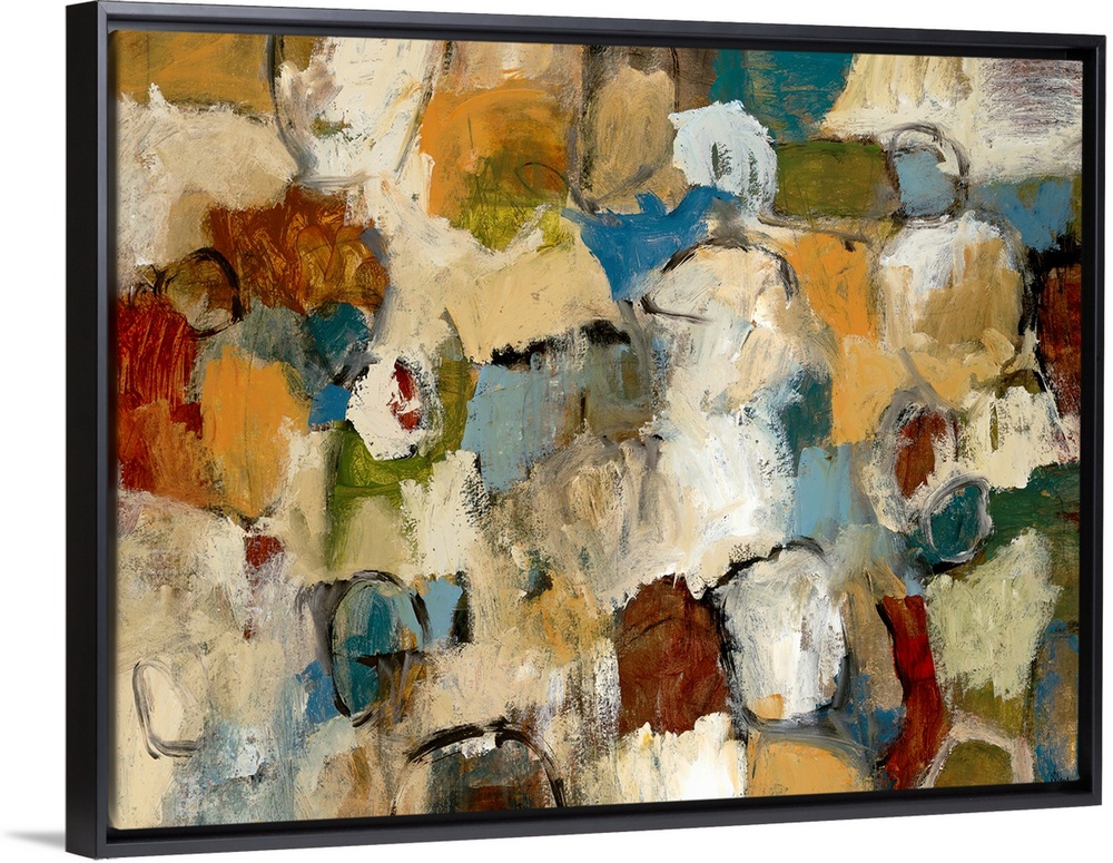 <p>Big abstract art incorporates variously sized patches of different earth tones layered on top and next to each other. All of the patches have rough edges and none of them conform to standard shapes.</p>