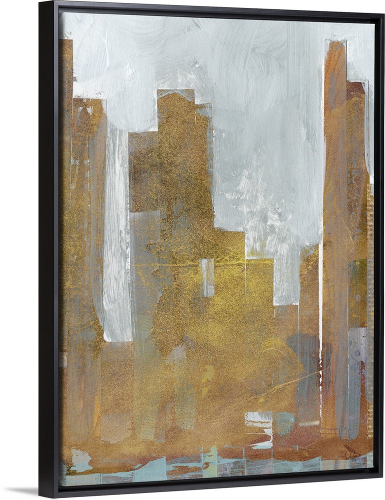 <p>Contemporary abstract artwork using muted colors and geometric shapes resembling a city skyline.</p>