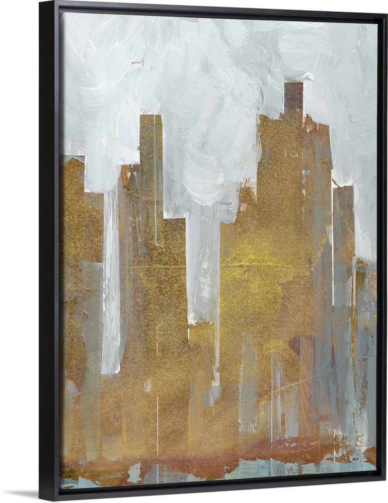 <p>Contemporary abstract artwork using muted colors and geometric shapes resembling a city skyline.</p>