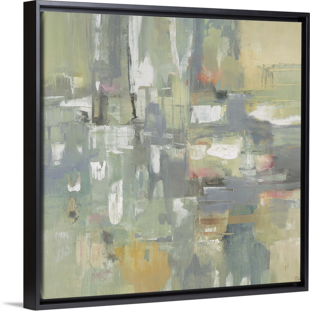 <p>Contemporary abstract painting of pale muted green geometric shapes colliding together.</p>