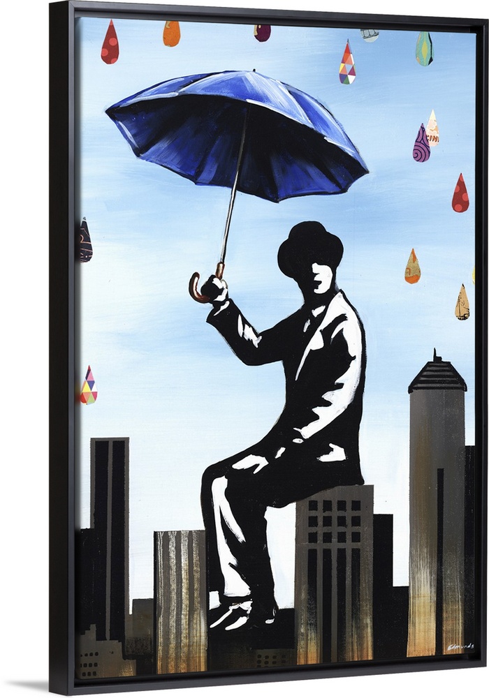 <p>Mixed media artwork with a painting of a man holding a blue umbrella, sitting on a skyscraper rooftop while colorful raindrops fall from the top.</p>