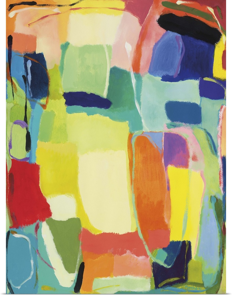 <p>Abstract painting of soft, rounded rectangular shapes in bright, spring-like colors</p>