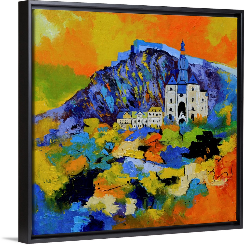 <p>Abstract representation of the city of Dinant, Belgium with Notre Dame de Dinant and surrounding buildings laid against colorful rocky mountains with vibrant patches of color all over.</p>