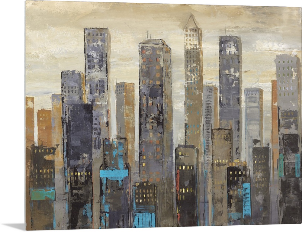 <p>Contemporary city skyline painting in dark tones.</p>