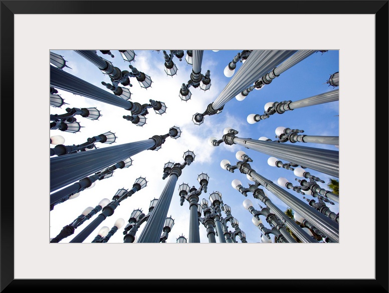 <p>Big photograph taken from the ground looking up focuses on an art display incorporating vast amounts of light posts set in rows.</p>