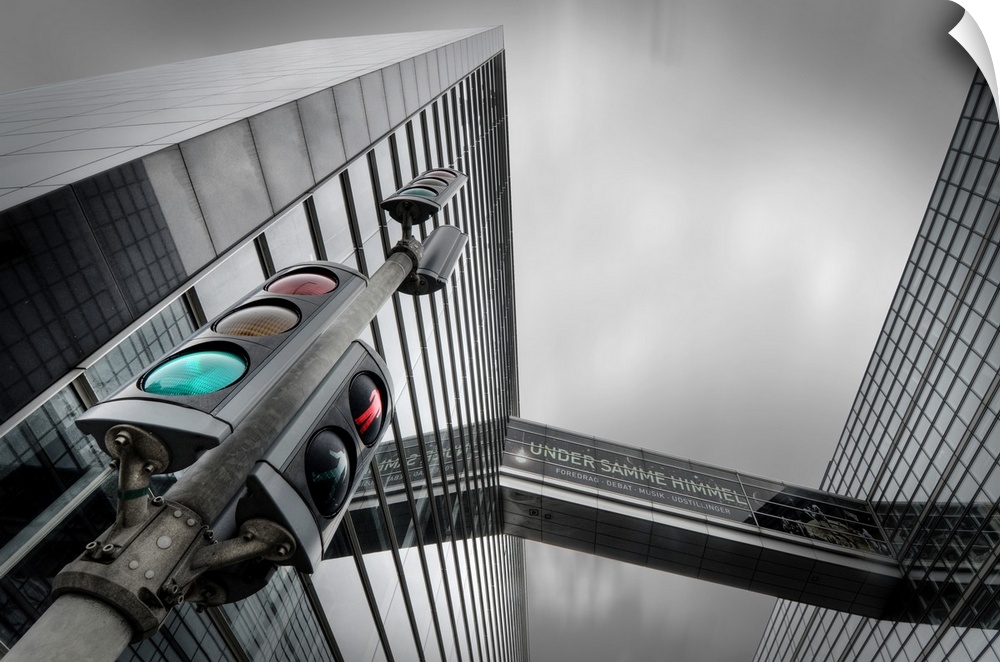 <p>A walkway between two buildings with a traffic light in the foreground, Copenhagen, Denmark.</p>