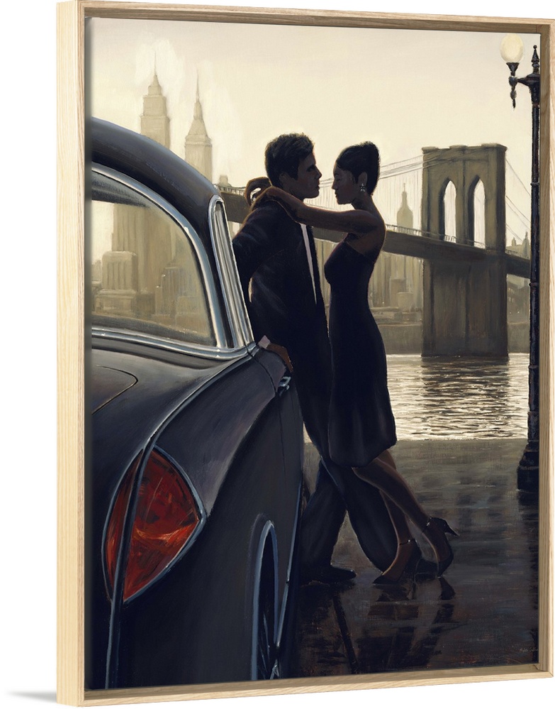 <p>Contemporary figurative painting of a man and woman having an intimate moment with the Brooklyn Bridge in the background.</p>