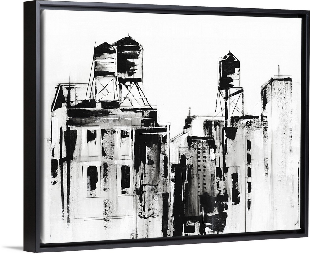 <p>Black and white painted sketch of an urban cityscape.</p>
