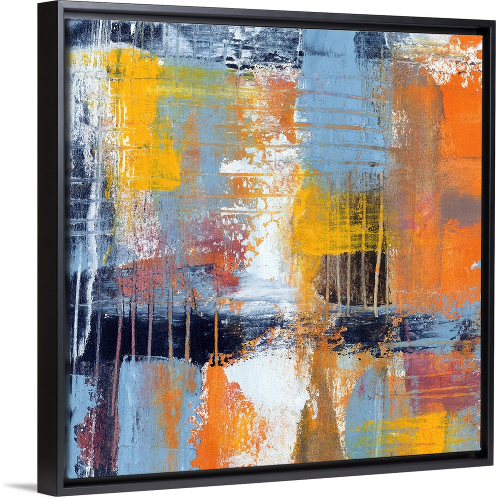 <p>Colorful contemporary abstract painting using muted blue orange and yellow tones.</p>