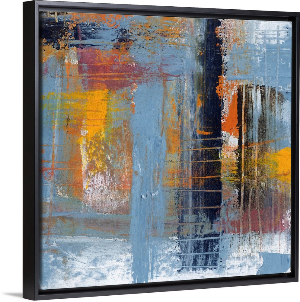 <p>Colorful contemporary abstract painting using muted blue orange and yellow tones.</p>
