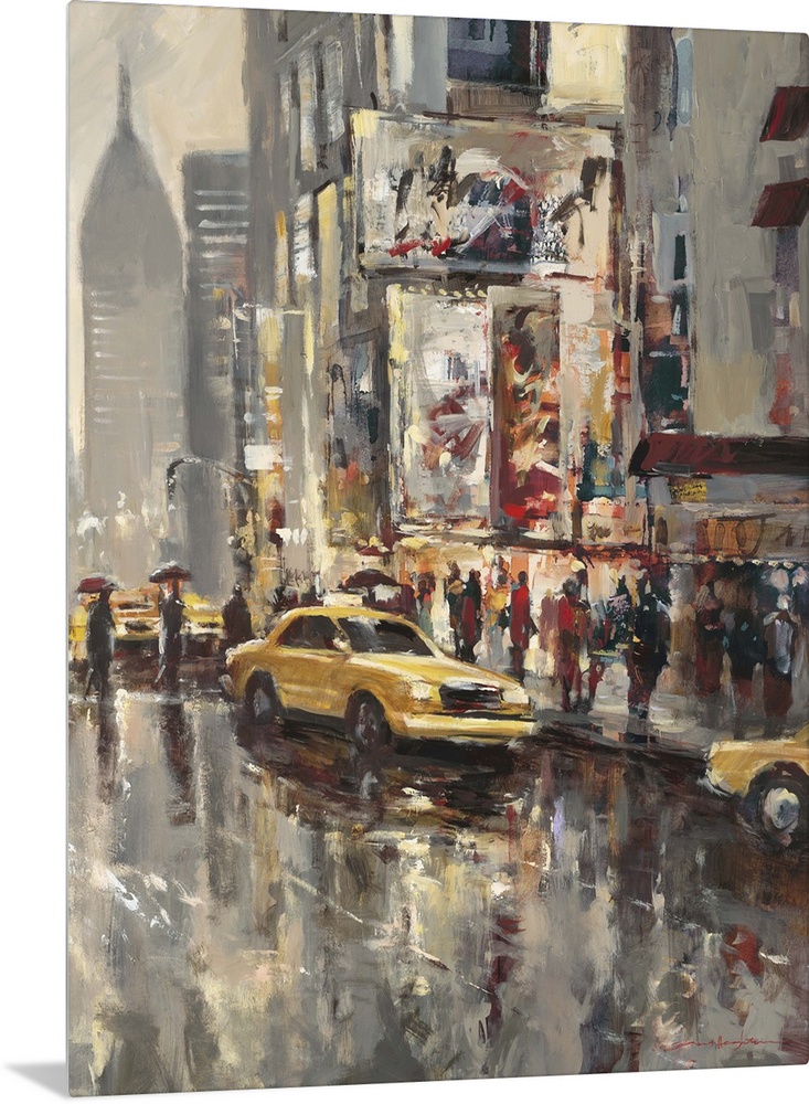 <p>Painting of city streets with people and taxi's casting reflections on a wet road, with tall buildings in the background.</p>