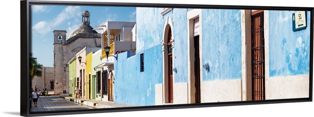 <p>Panoramic photograph of a street scene in Campeche, Mexico, with a bright blue building. From the Viva Mexico Panoramic Collection.</p>