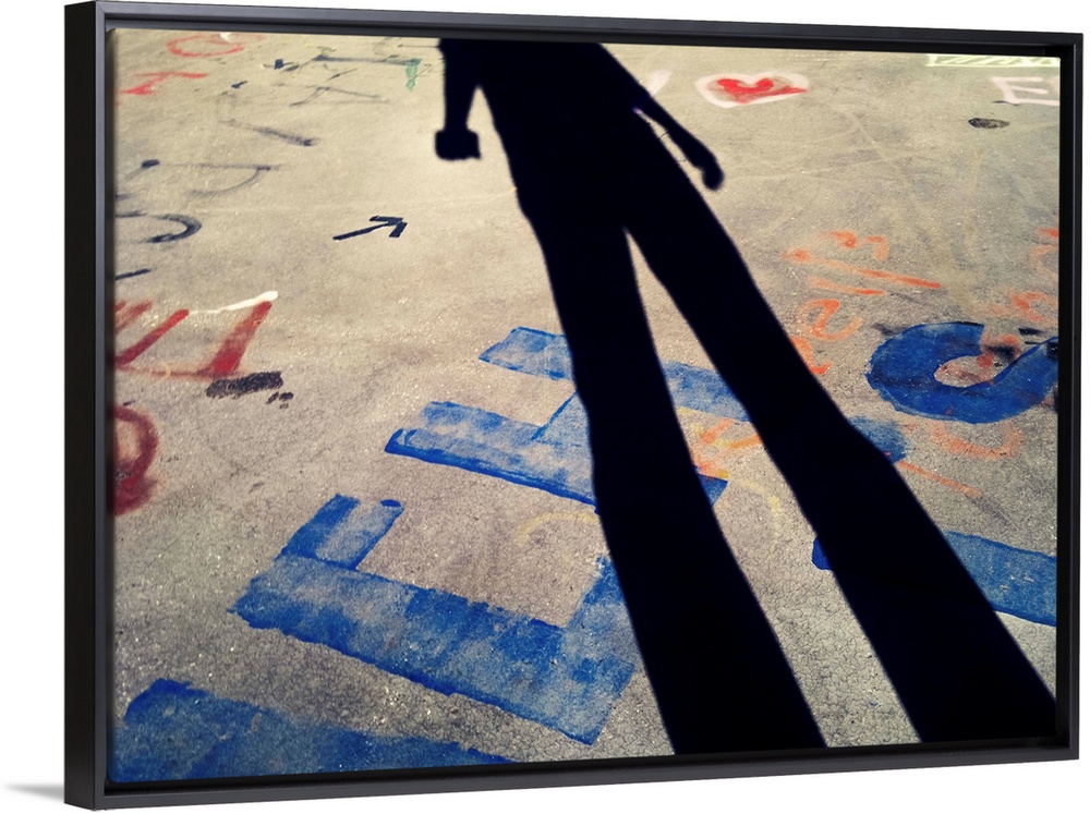 <p>Man taking snapshot of his shadow together with colorful graffiti and tag lines on ground.</p>