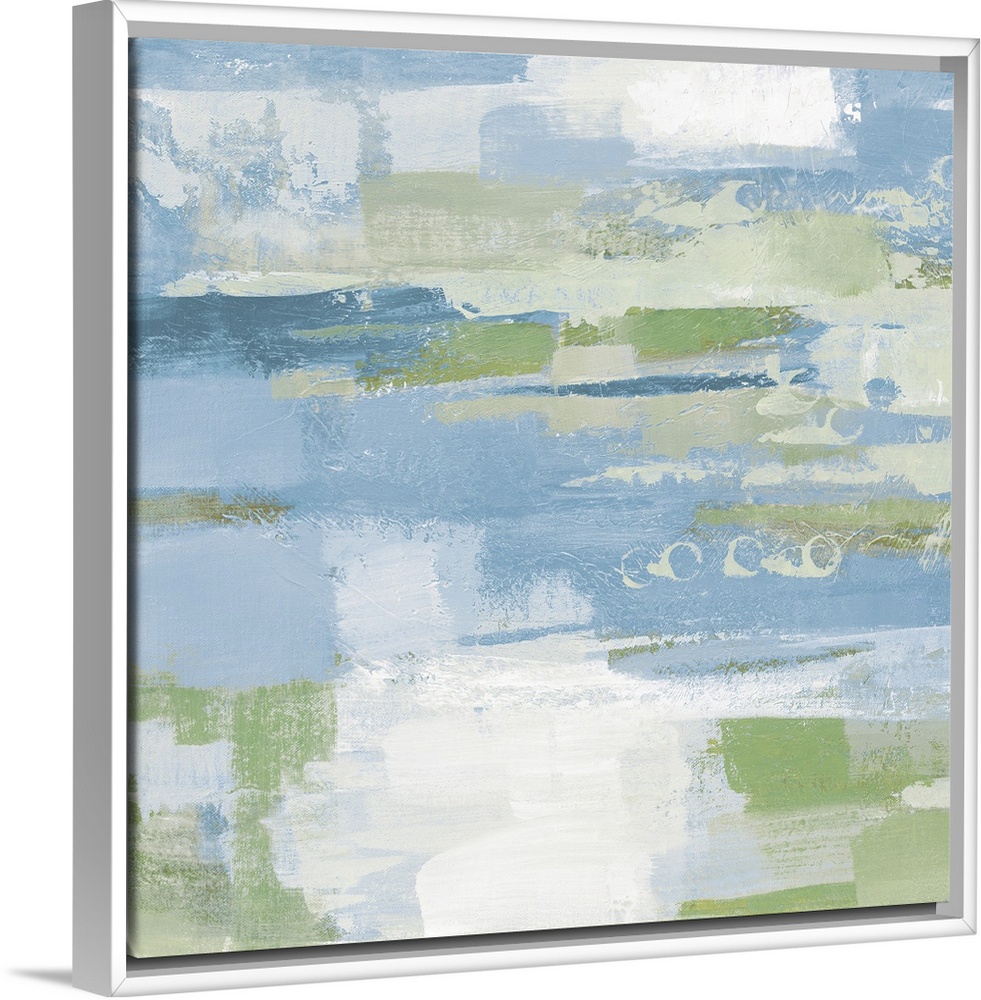 <p>A square abstract painting of horizontal brush strokes in textured tones of blue, green and white.</p>