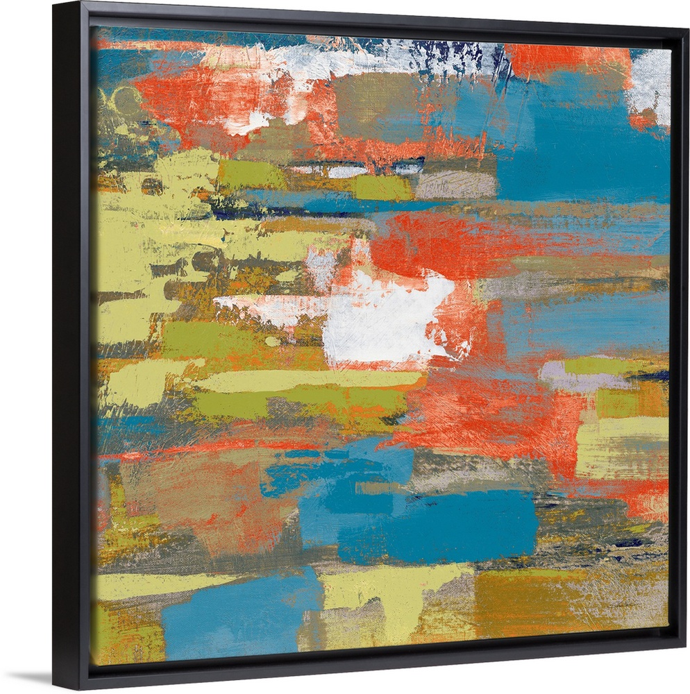 <p>Large abstract painting made with shades of green, blue, gray, orange, and white on a square canvas.</p>