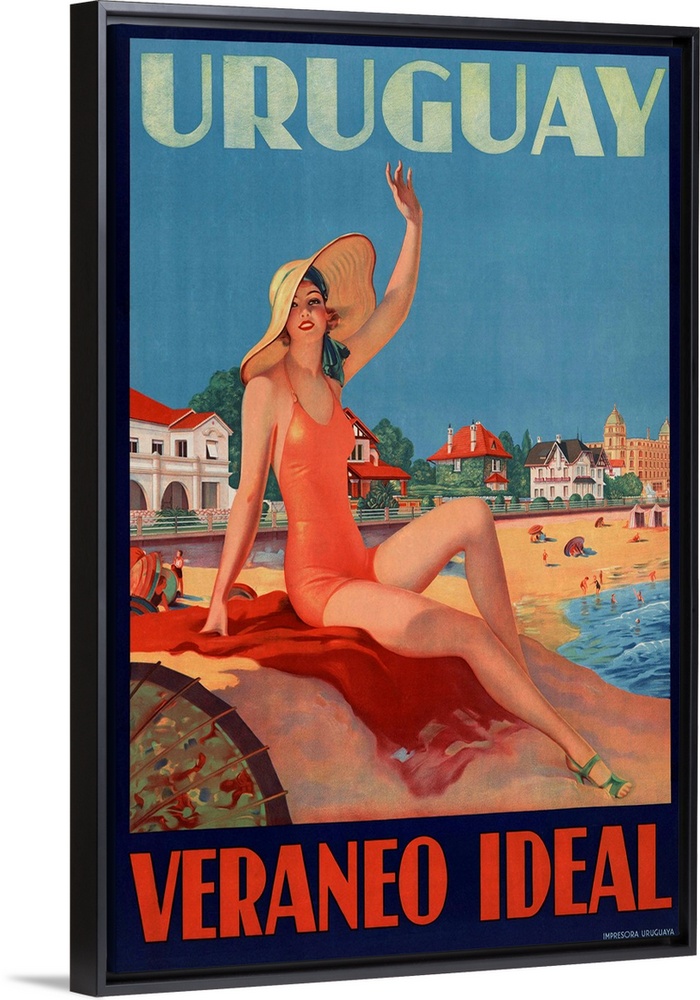 <p>Uruguay, Veraneo Ideal. (Uruguay-Ideal Summer Holiday). 1930s travel poster shows a bathing beauty at the beach.</p>