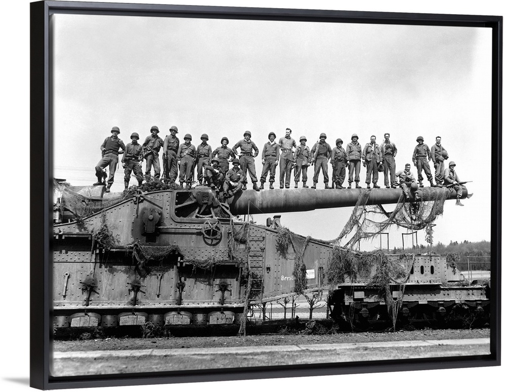 <p>U.S. Army soldiers stand on top of a large 274mm railroad gun, 1945.</p>