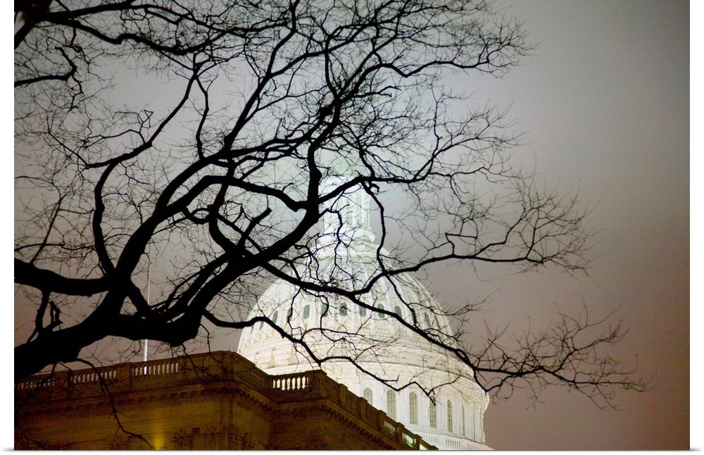 <p>US Capitol at night in fog, Washington D.C., USA</p>