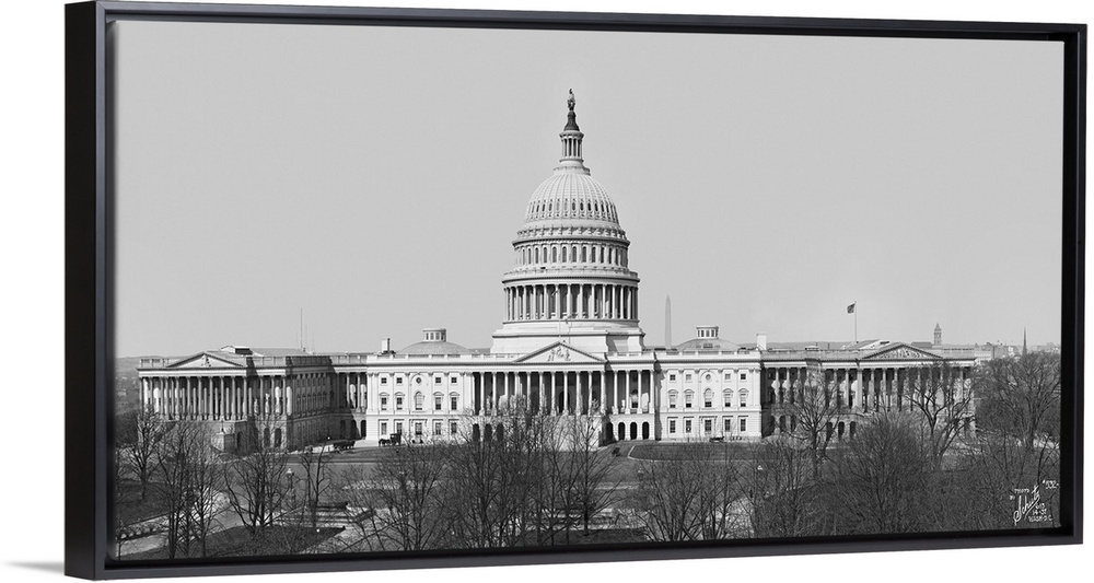<p>Big, horizontal vintage photograph of the Capitol Building in Washington DC, beneath a clear sky and surrounded by bare trees, taken in 1916.</p>