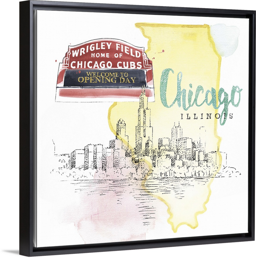 <p>Square watercolor and ink illustration of a Chicago skyline with a Wrigley Field sign and a yellow outline of the state of Illinois.</p>