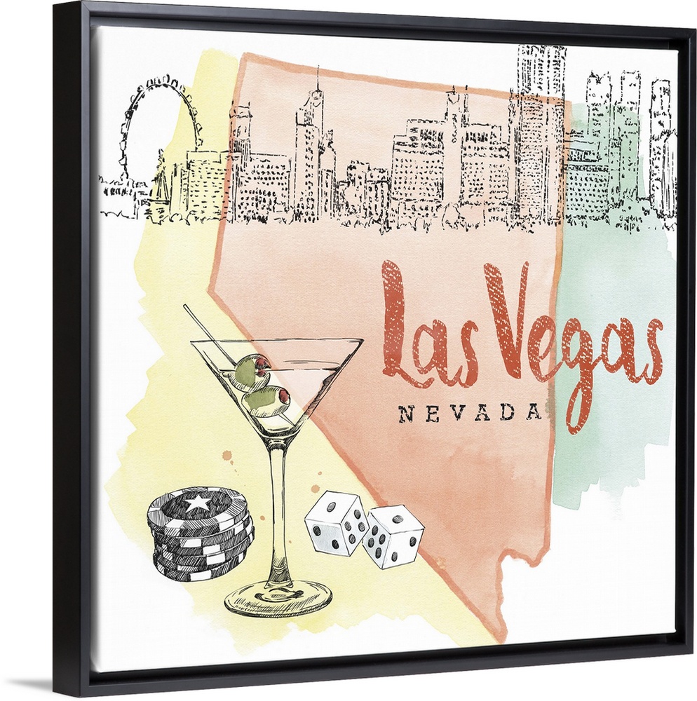 <p>Square watercolor and ink illustration of a Las Vegas skyline with a martini glass, poker chips, dice, and a red outline of the state of Nevada.</p>