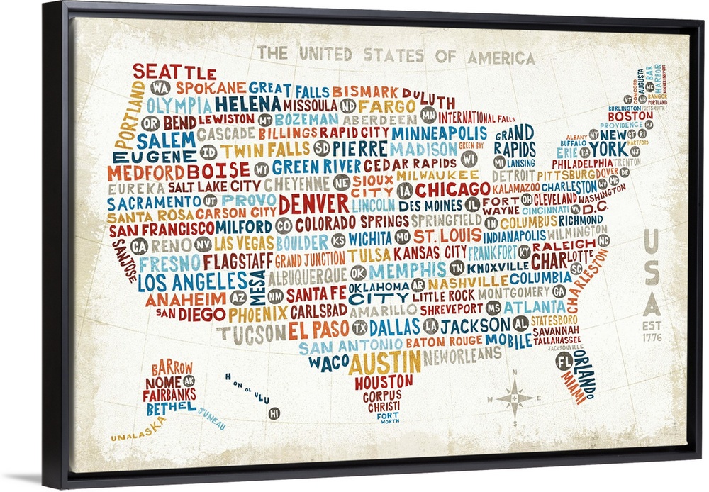 <p>A map of the United States with the names of large cities in colorful text.</p>