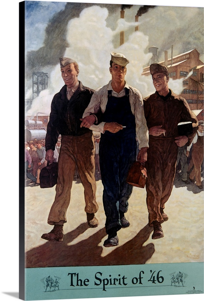 <p>Commissioned in the immediate aftermath of World War II, this government-issued poster by Ben Shahn champions the postwar American labor force. Depicting three resolute industrial workers striding forward with lunch pails and tools in hand, the composition evokes strength, unity, and optimism. Smokestacks, machinery, and the presence of a working crowd in the background frame the transition to a peacetime economy powered by American industry. This iconic image embodies the renewed civic purpose of 1946-where building peace was just as essential as winning the war.</p>