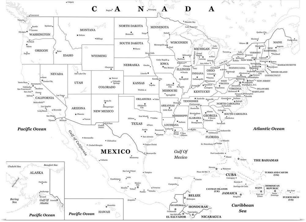 <p>Black and white outlined map of the United States with a classic font.</p>