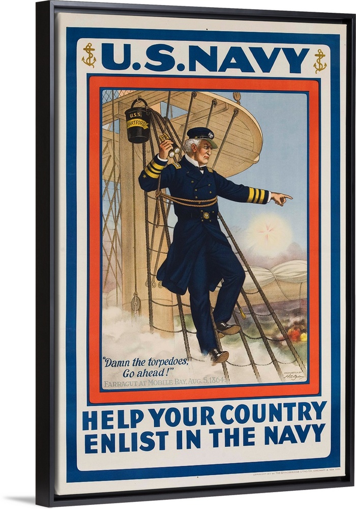 <p>World War I poster. Help Your Country , Enlist in the Navy, Image of Admiral Farragut with the quote, Damn the Torpedos, Go Ahead!</p>