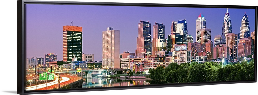 <p>Panoramic photograph taken at nighttime in the largest city within Pennsylvania shows a group of skyscrapers and buildings towering over the rest of the city and reflecting over a body of water in the foreground. Photographer uses a slow shutter speed to get the fast moving effect on the lights.</p>