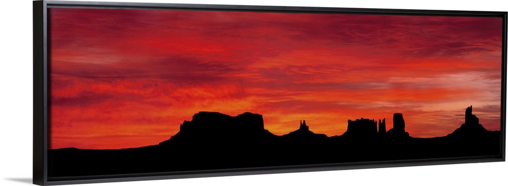<p>Panoramic photograph of silhouettes of huge rock formations in the desert at sunset under a cloudy sky.</p>