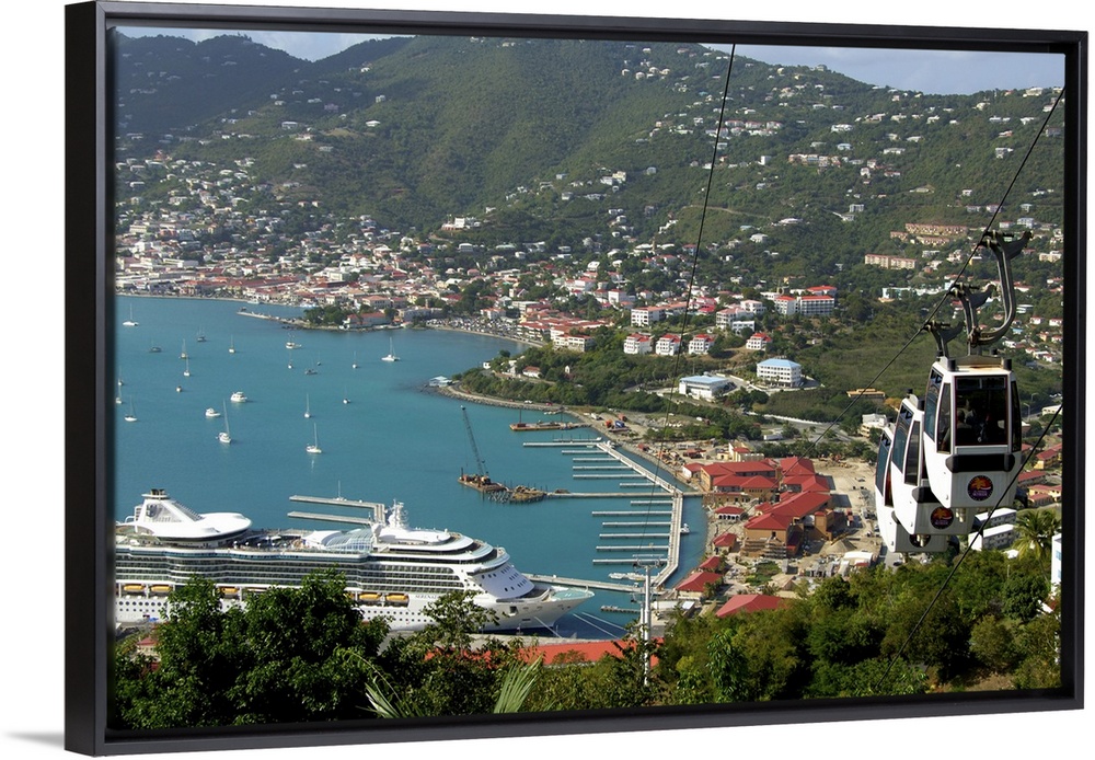 <p>Caribbean, U.S. Virgin Islands, St.Thomas, Charlotte Amalie, Paradise Point, St. Thomas Skyride. Tram cars overlooking cruise harbor.</p>