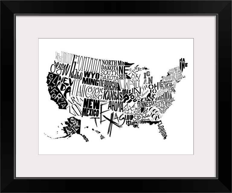 <p>A contemporary typography map of the United States with all the state names in black and white.</p>