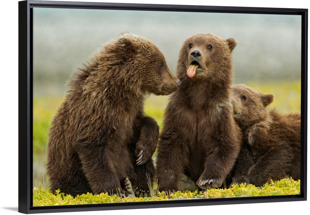 <p>USA, Alaska, Katmai National Park, Grizzly Bear Spring Cub (Ursus arctos) sticks out tongue while resting on tidal flats along Kukak Bay.</p>