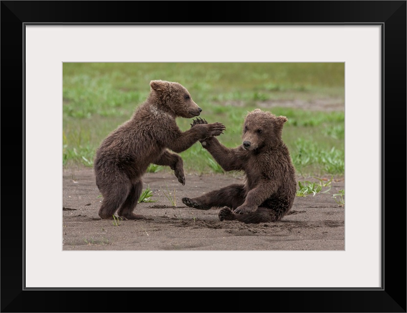 <p>USA, Alaska, Katmai National Park, Hallo Bay. Coastal Brown Bear, Grizzly, Ursus Arctos. Twin grizzly bear cubs playing and wrestling.</p>