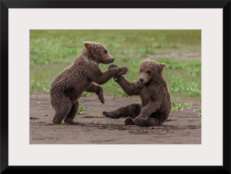 <p>USA, Alaska, Katmai National Park, Hallo Bay. Coastal Brown Bear, Grizzly, Ursus Arctos. Twin grizzly bear cubs playing and wrestling.</p>