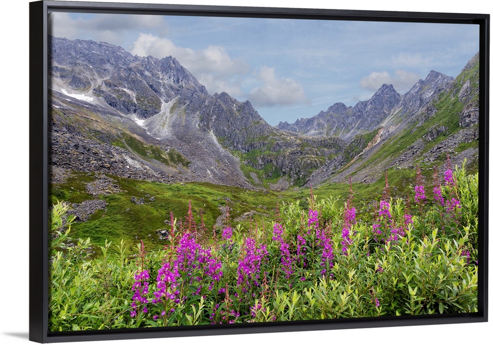 <p>USA, Alaska, Talkeetna Mountains. Mountain landscape with fireweed flowers.</p>
