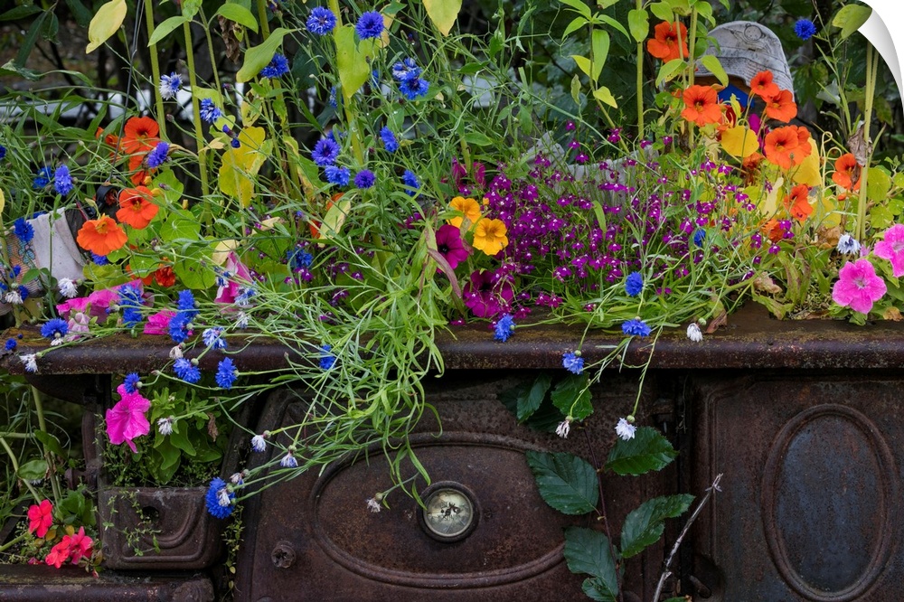 <p>USA, Alaska, Wiseman. Flowers planted in vintage cook stove.</p>