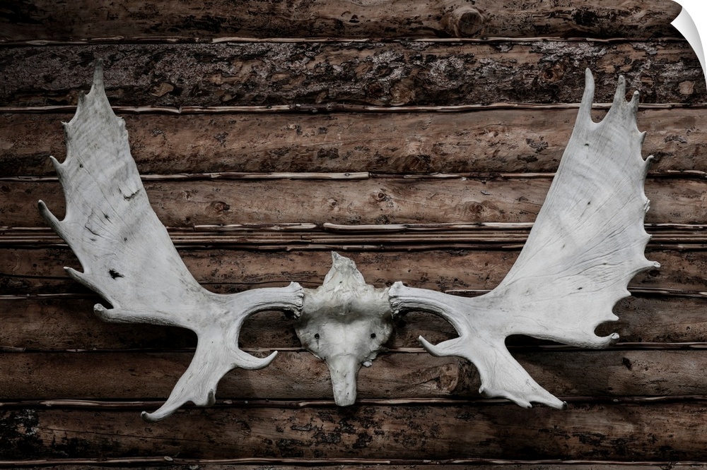 <p>USA, Alaska, Wiseman. Moose antlers on log cabin wall.</p>