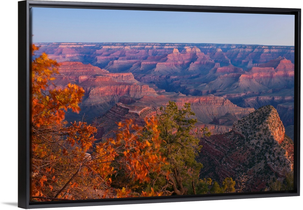 <p>Giant, landscape photograph of fall colored tree tops overlooking large rock formations as the sun rises over the Grand Canyon, in Arizona.</p>