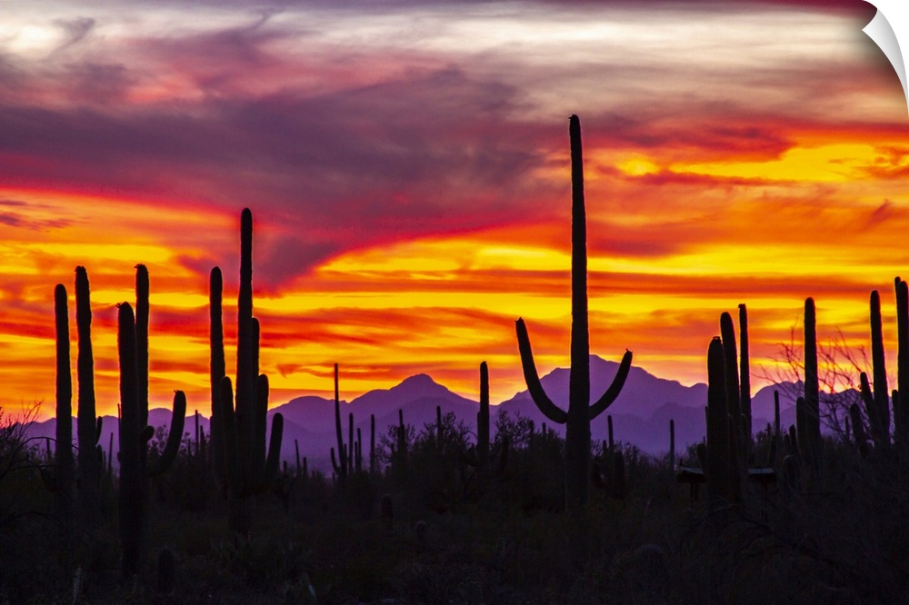 <p>USA, Arizona, Saguaro National Park. Saguaro cacti and mountain silhouette at sunset.</p>
