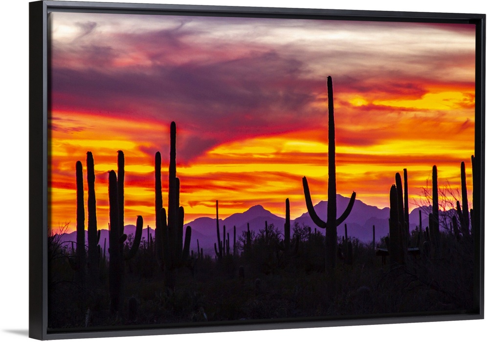 <p>USA, Arizona, Saguaro National Park. Saguaro cacti and mountain silhouette at sunset.</p>
