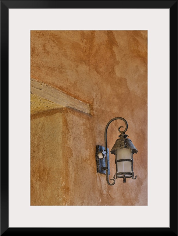 <p>USA, California, Carmel. Inside the grounds at the Carmel Mission Basilica Museum old iron lamp on stucco wall.</p>