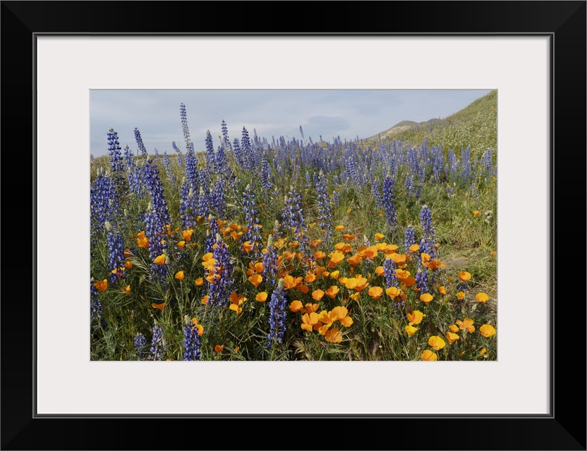 <p>USA, California, Mojave Desert. California poppies and silver lupine flowers in the spring.</p>