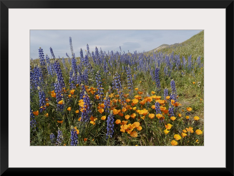 <p>USA, California, Mojave Desert. California poppies and silver lupine flowers in the spring.</p>