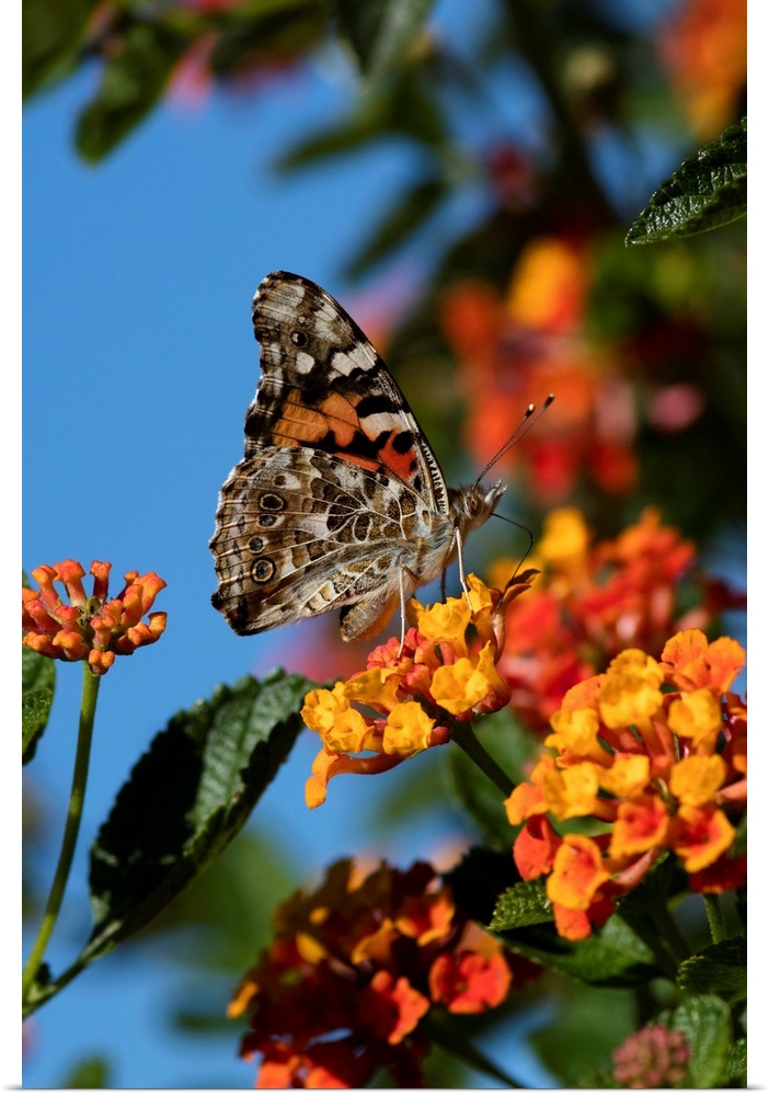 <p>USA, California. Painted lady butterfly on lantana flowers.</p>